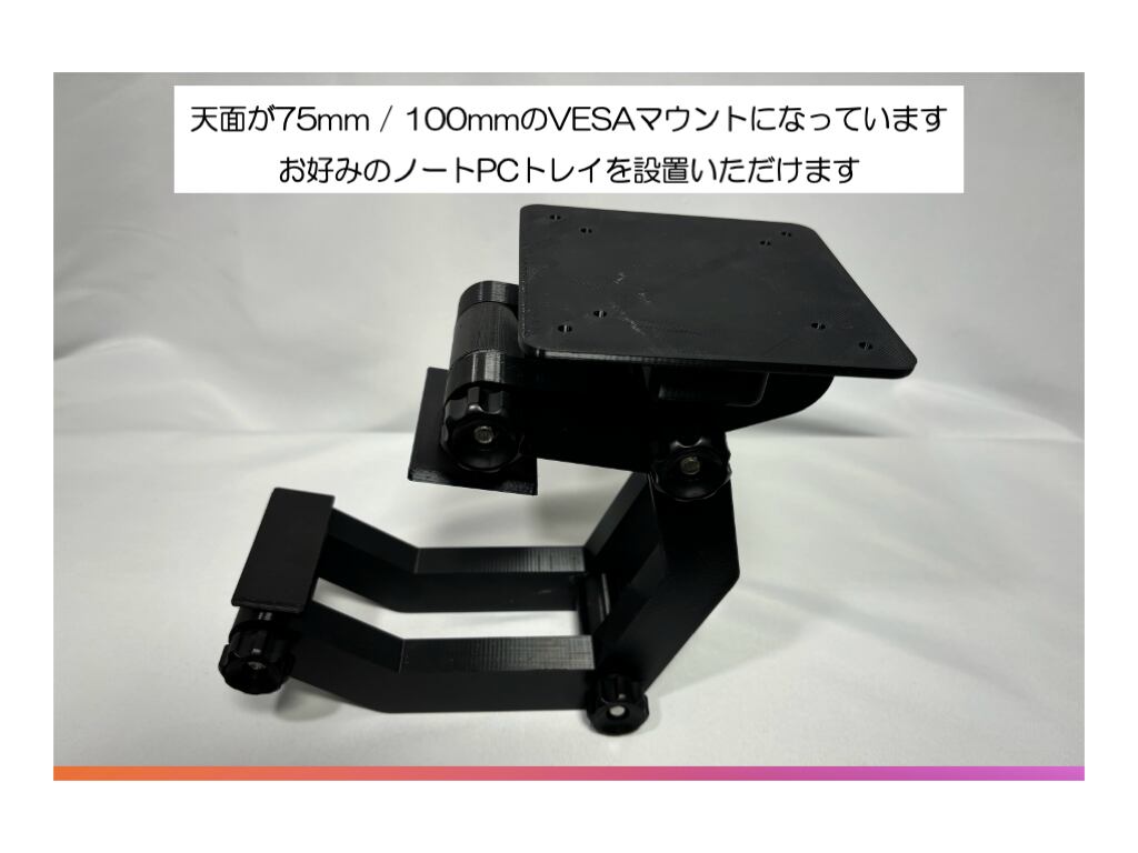 製品としては75mmと100mmのVESA対応の穴が空いているマウントです。ノートPCは別売りとなり、お好みのノートPCトレイを使用していただくことができます。